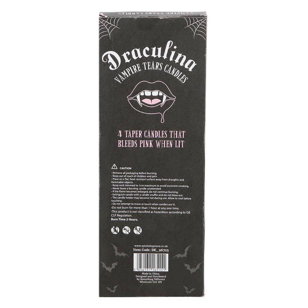 Add a touch of gothic glamour to your space with this set of four unscented pink taper candles. When lit, each candle reveals dramatic “vampire tears” drip detailing — perfect for spooky‑cute dinner parties, moody décor, or a standout gift for the girly goth in your life.